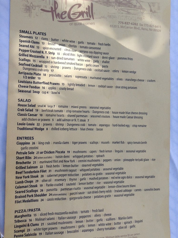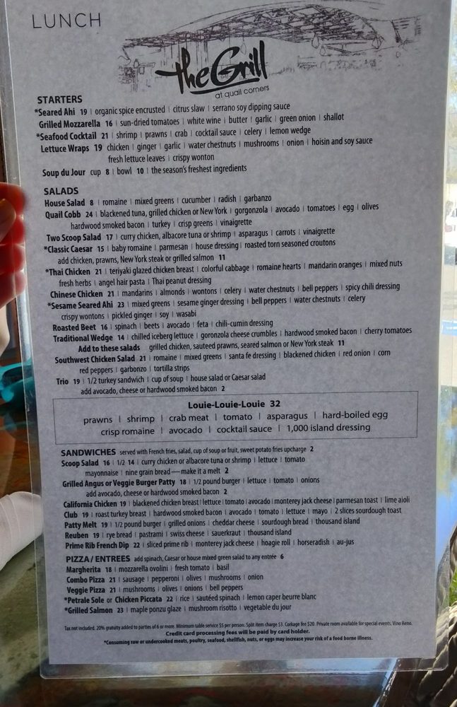 "The Grill At Quail Corners" is a stylish American restaurant located in Reno, NV. This establishment offers a wide range of amenities including outdoor seating, private dining options, and a full bar with happy hour specials. The menu features delicious lunch options such as the California Chicken Sandwich with avocado and lime aioli, the Chinese Chicken Salad with mandarins and almonds, and the Grilled Mozzarella starter with sundried tomatoes. The attention to detail in the dishes, along with the use of high-quality ingredients, truly makes dining at The Grill At Quail Corners a delightful experience. The welcoming atmosphere and exceptional service add to the overall enjoyment of the meal. Don't miss out on this gem for your next lunch or dinner outing.